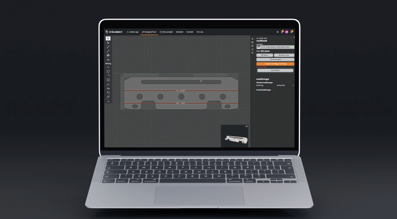 Med vårt interaktiva CAD-verktyg tar du kontrollen över designen själv. Rita upp din detalj och lägg till bockning, håltagning, hålfasning, gängning, textformning och gravering– se priset på din detalj direkt i verktyget!