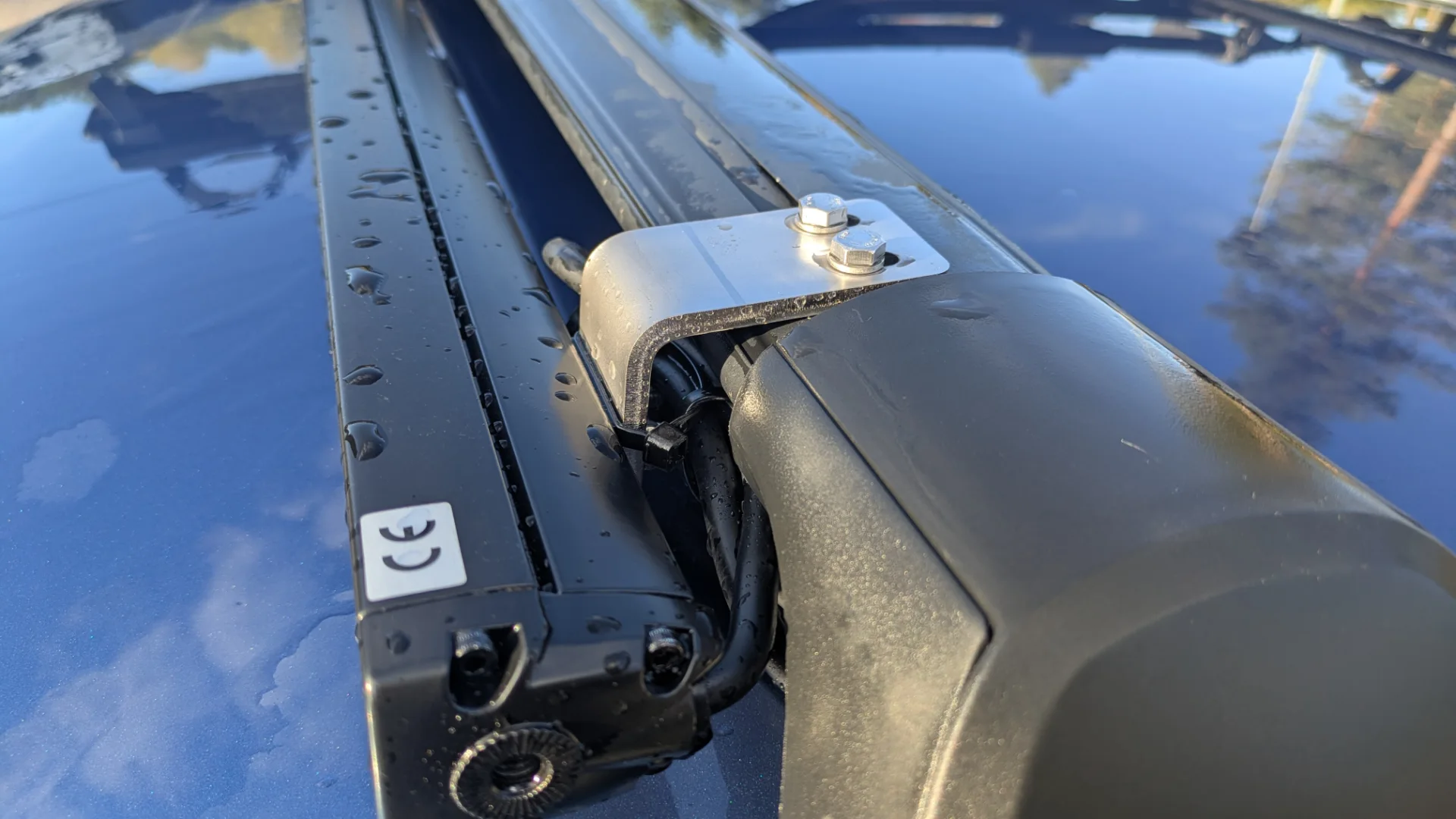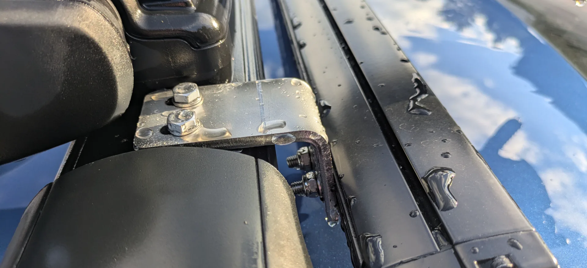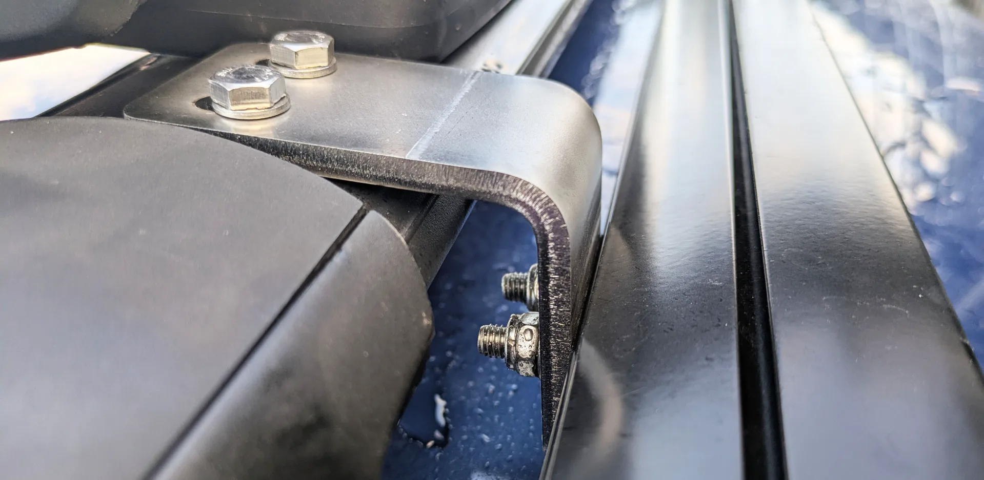 ”Till min personbil ville jag ha fästen för att montera en extra ljusramp tight och diskret i mitt befintliga takräcke. Det består av två rostfria vinkeljärn bockade 84° för att få rätt vinkel på rampen, och spår urtagna för skruvar så det finns justermån. Dessutom sitter det en bit rostfri plåt inuti takräcket med gängade hål i för att skruva fast vinkeljärnet i takräcket.”