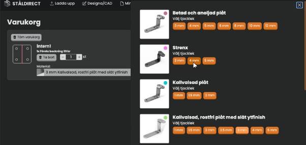 Välj material, tjocklek och kvantitet. Ingen offert krävs.